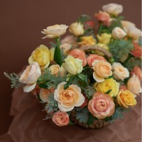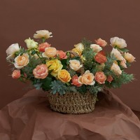 Корзина с ручкой размер L, розы одноголовые и кустовые и сезонная зелень (длина комопозиции до 1м).