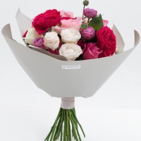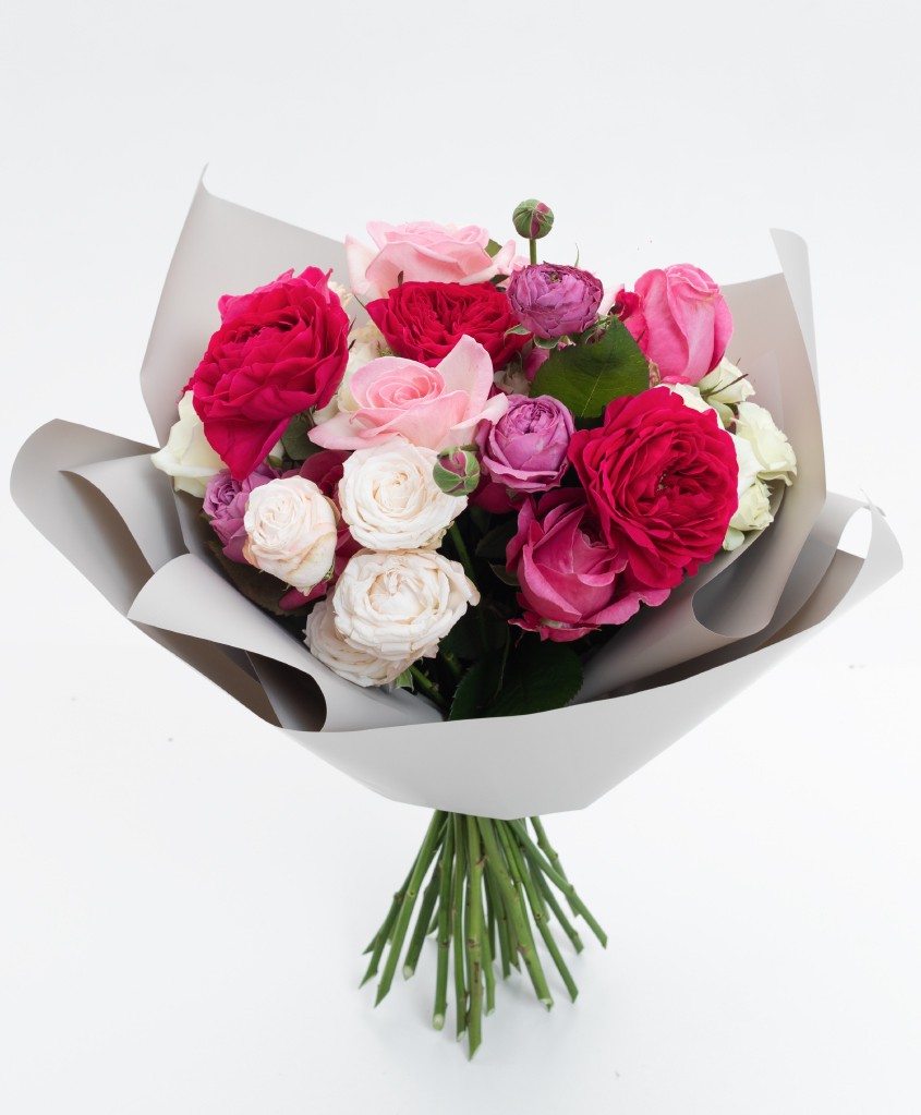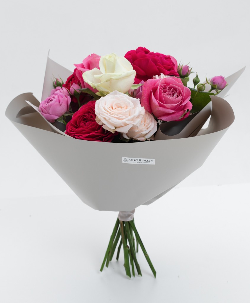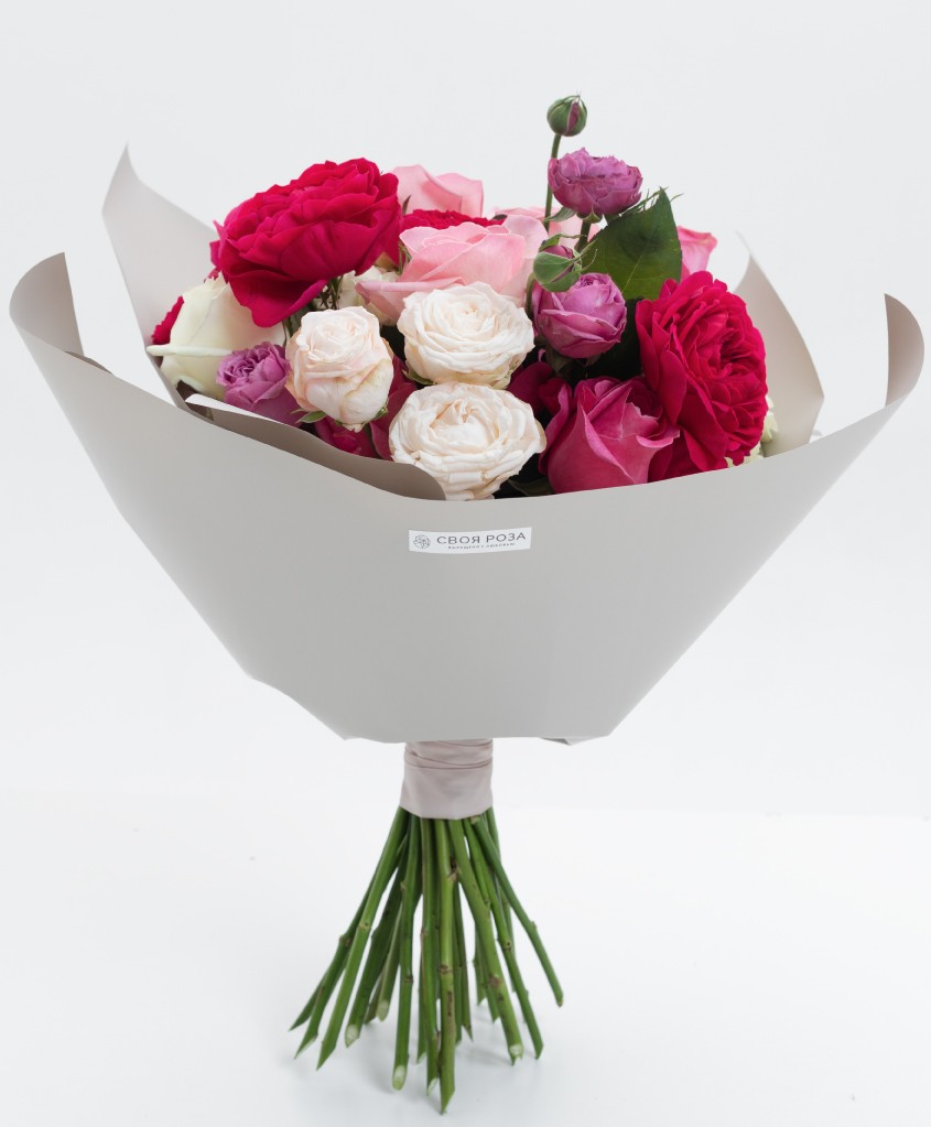 Сборный букет в ярко-розовой гамме из 4х форм роз: кустовых, пионовидных, кустовых пионовидных и одноголовых.