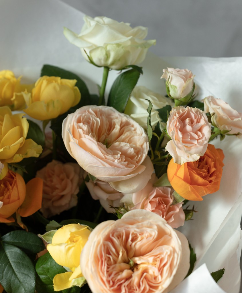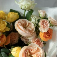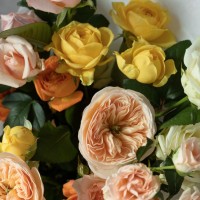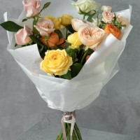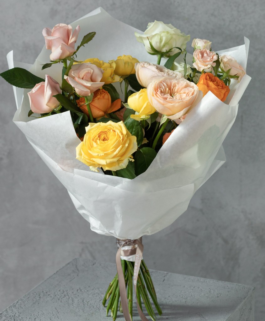 Сборный букет в желтой, оранжевой, персиковой гамме из 4х форм роз : кустовых, пионовидных, кустовых пионовидных и одноголовых.
